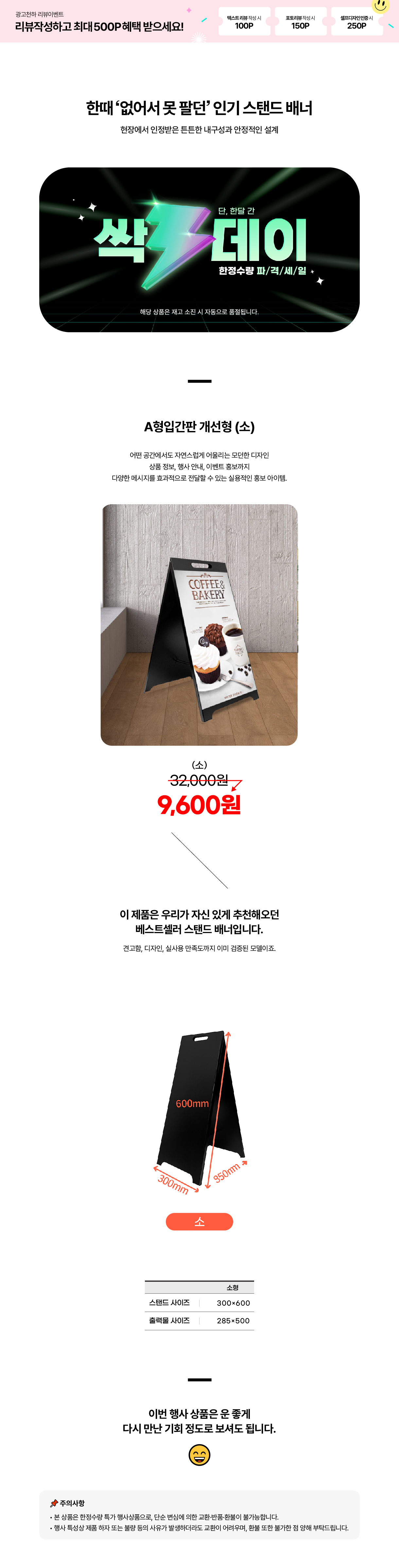 HOME > 싹쓰리데이 > 스탠드배너 > A형입간판 개선형 소